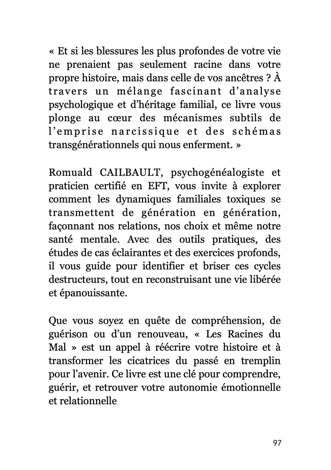Dans Les Racines du Mal, je vous révèle comment les blessures invisibles de nos ancêtres – secrets, traumas et schémas répétés – continuent de façonner nos vies, nos relations et même nos choix les plus intimes.
